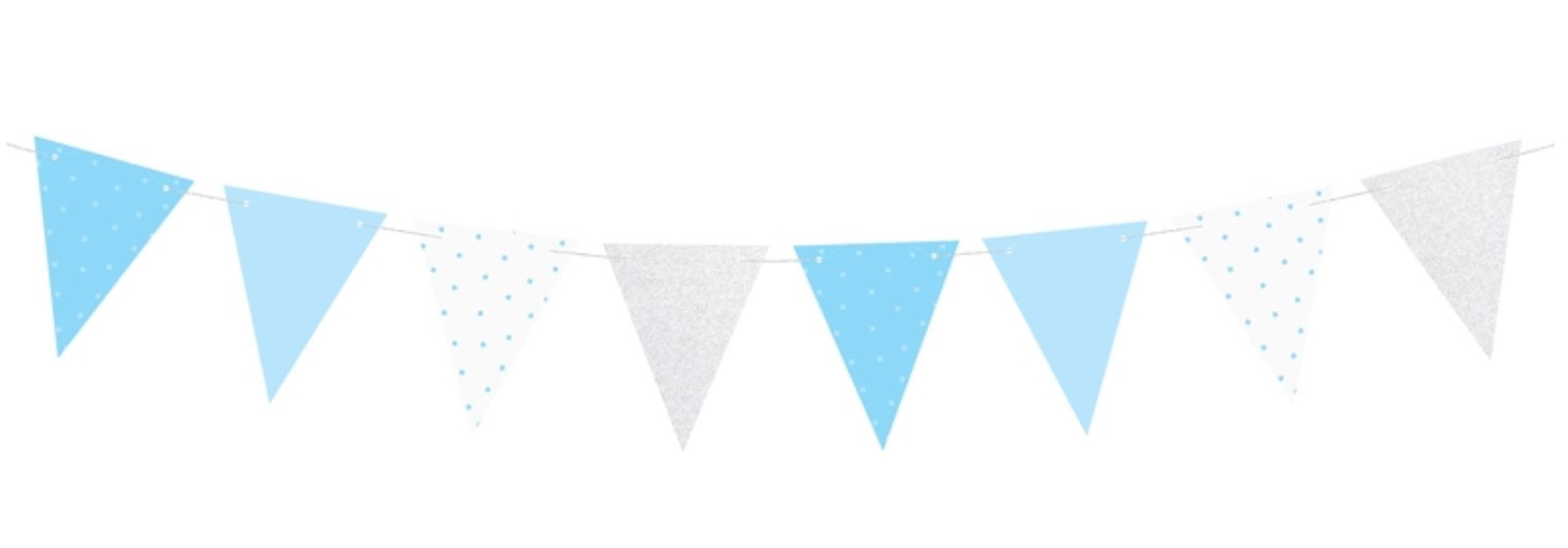 Dekorera ditt kalas med detta vackra flaggspel med 8 vimplar i blått, vitt och glittrig silver på ett 2 meter långt snöre. Perfekt för att skapa en festlig atmosfär!