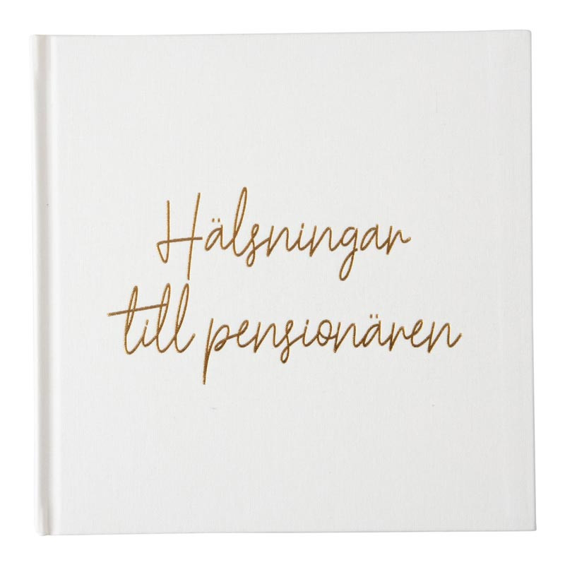 Den vita gästboken med guldtext, ”Hälsningar till pensionären”, är en vacker bok med 24 ark/48 sidor. Bladen är blanka och perfekta för att fyllas med minnesvärda ord och bilder. En uppskattad gåva till den nyblivna pensionären.