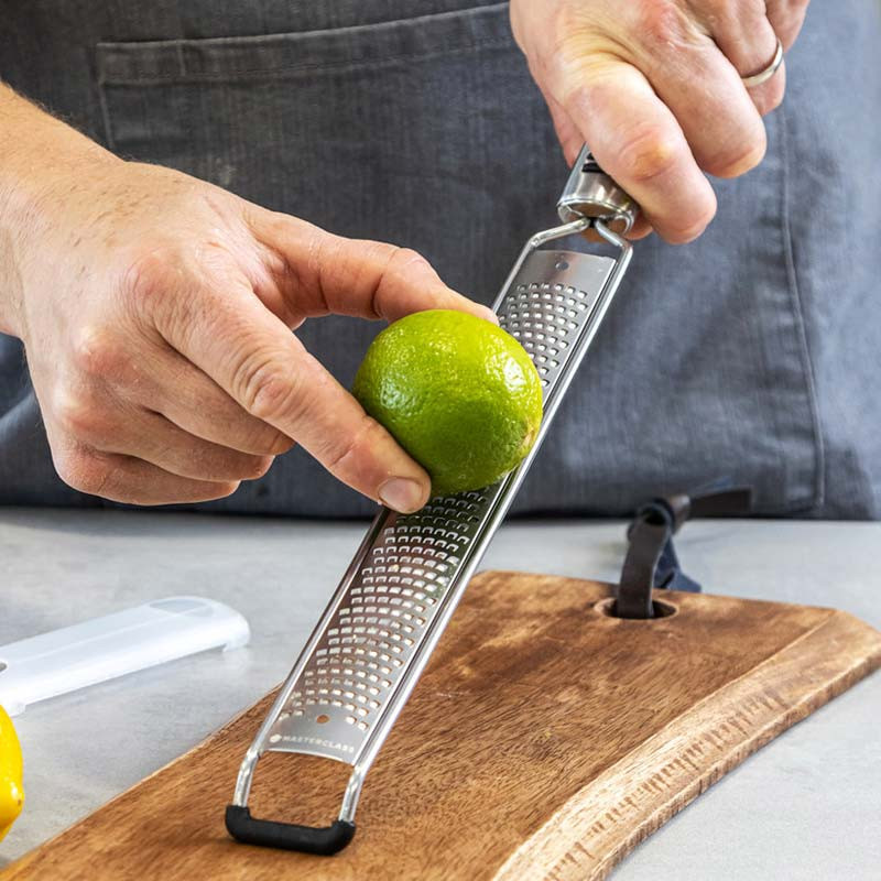 Upptäck det mångsidiga zestjärnet från Masterclass, ett långt och smalt rivjärn i rostfritt stål som är oumbärligt i köket. Perfekt för att riva parmesan, citrusskal, vitlök eller muskot. Handtaget är utformat med antislip för ett stabilt grepp, och den praktiska upphängningsöglan gör förvaringen enkel. Ett idealiskt verktyg för matlagning och bakning.